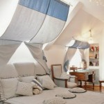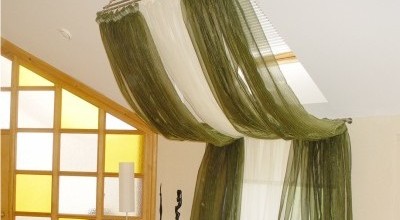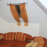 А что делать с обычными занавесками, скроенными собственноручно? Тут на помощь придут гардины для мансардных окон, главная особенность которых в том, что их должно быть две штуки. К верхнему карнизу шторы подвешиваются, а нижний поддерживает их так, чтобы они не свисали вниз вертикально. Часто шторы к нижнему карнизу для мансардных окон даже не крепят, а просто затыкают их за него.