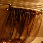 Достигается это при помощи нехитрого устройства: с обратной стороны штор нашиты легкие деревянные планки; по краям планок прикреплены кольца, сквозь которые пропущены шнуры. Эти шнуры и служат вместо направляющих; достаточно потянуть за шнур, и планки, скользя по нему, поднимутся вверх, складывая штору в гармошку.
