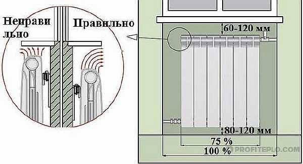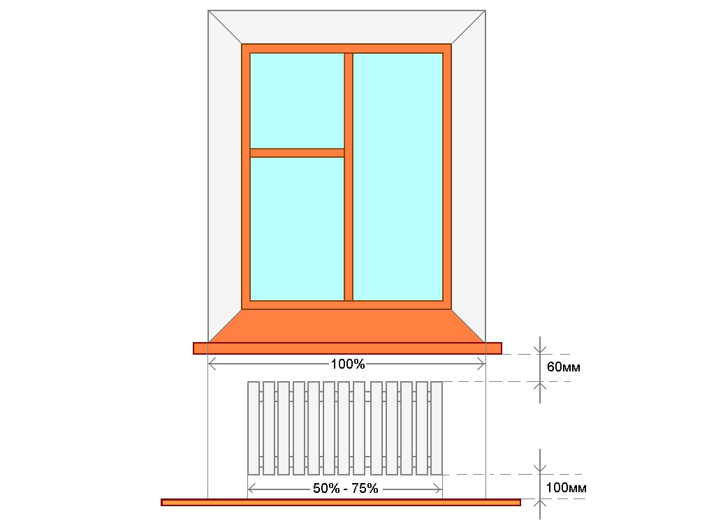 Высота радиатора над полом должна быть не менее 10 см, а расстояние между верхней точкой радиатора и подоконником — не менее 8 см.