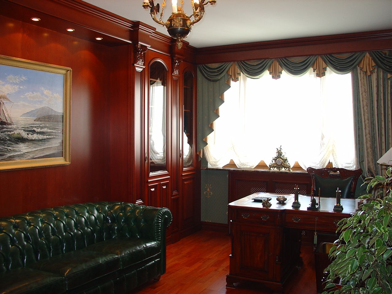 Кабинет предполагает наличие хорошего проникновения естественного освещения. В связи с этим оконный проем рекомендуется устанавливать на той же высоте, что и письменный стол. Так как стандартный рабочий стол имеет высоту не меньше семидесяти пяти сантиметров, то приемлемой высотой окна будет в пределах семидесяти – восьмидесяти пяти сантиметрах. При расположении письменного стола в отдаленной от окна части комнаты, высота оконного проема может быть снижена.